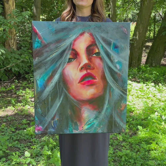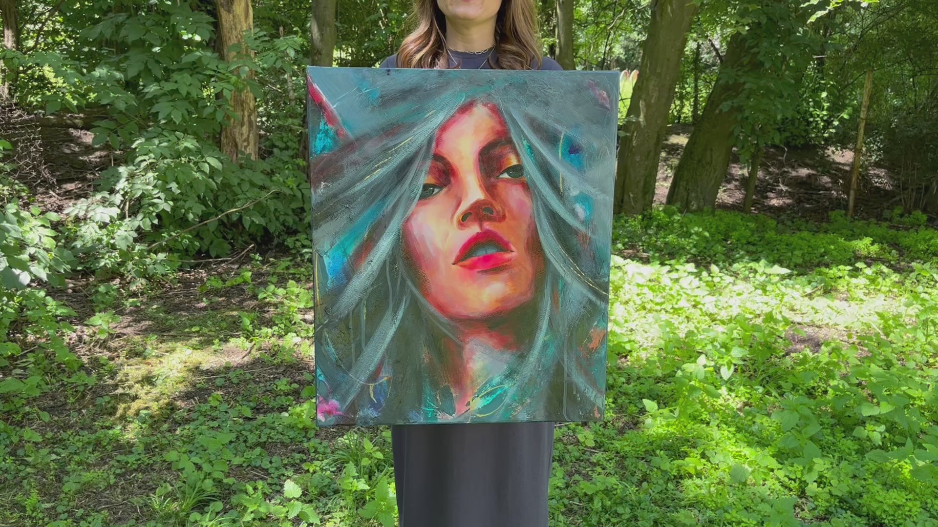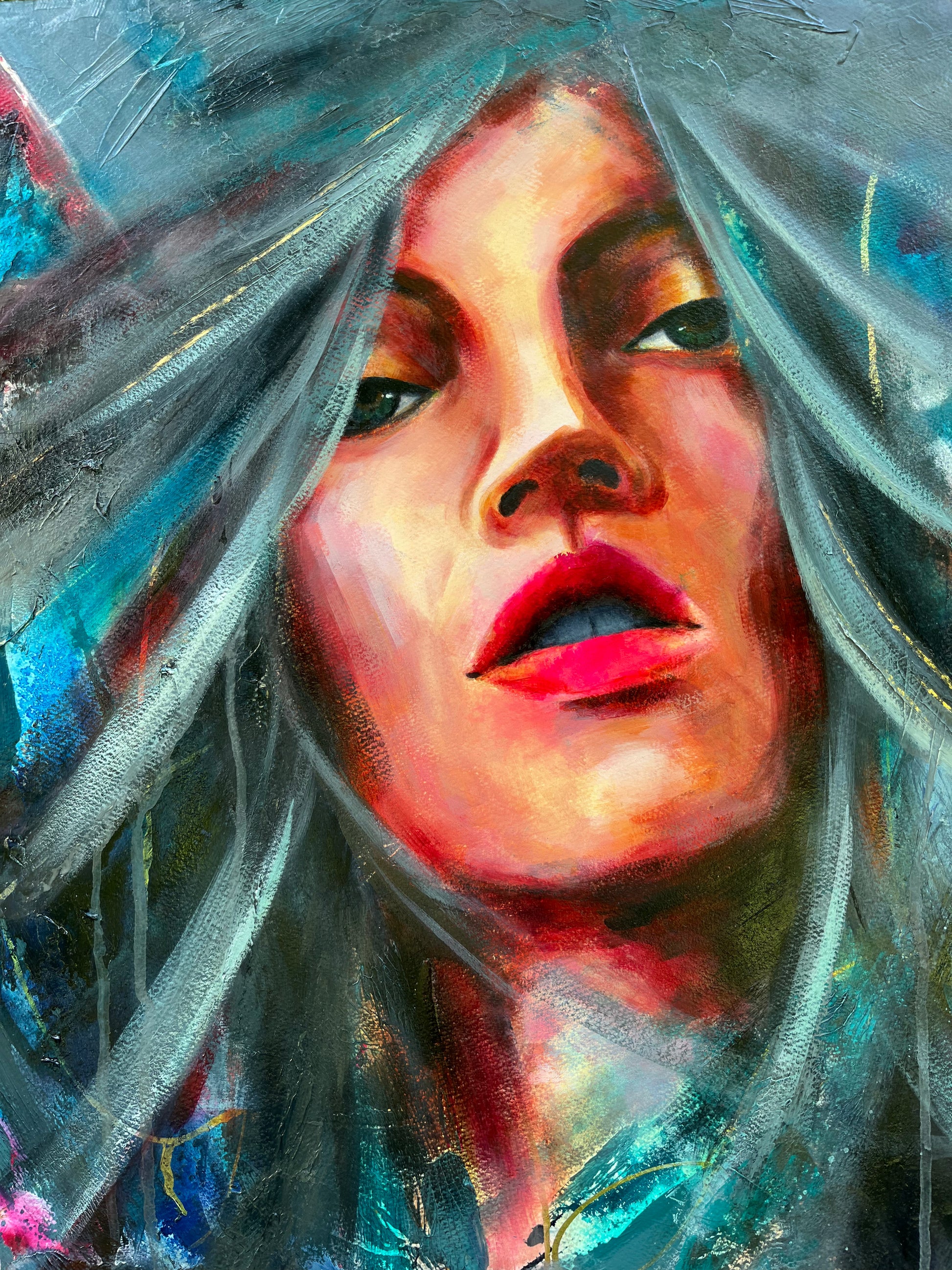 A woman emerges from shimmering layers of magenta, turquoise, and silver – as if caught between breath and thought. Her eyes turn inward, not outward; her lips slightly parted, holding a thought or receiving one.