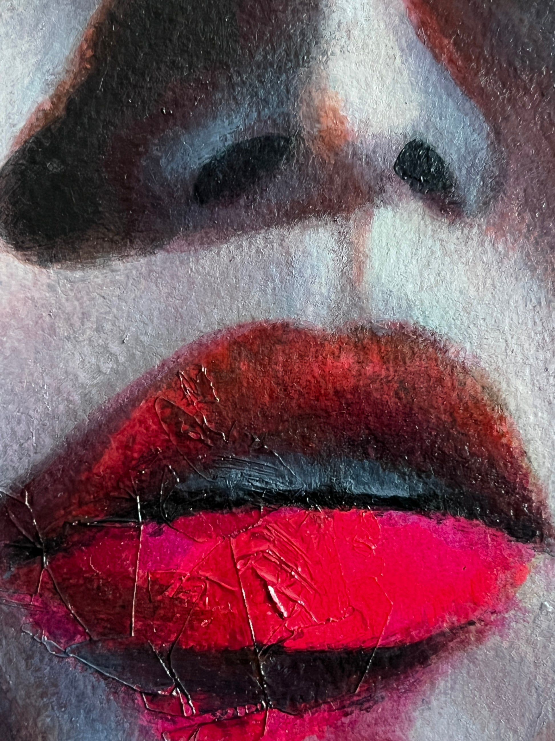 Fragmented, raw – and yet whole. The woman’s gaze breaks through layers, lines, and color fields. Her bold red mouth marks a threshold: this is where voice begins, and silence ends.